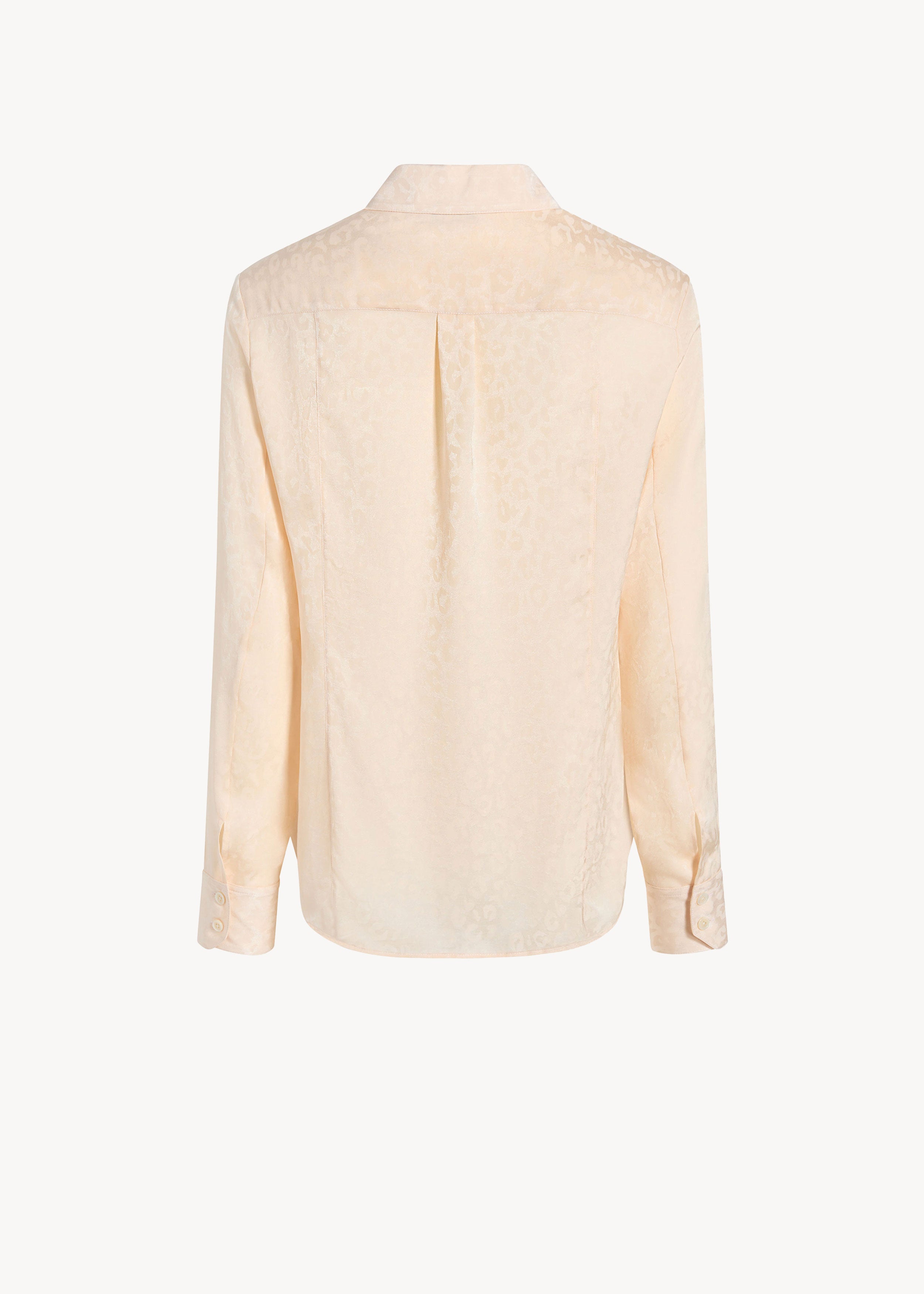 The Alex Top is a tailored, button-front blouse in tonal leopard jacquard, finished with shell buttons. Subtle texture and a refined pattern give dimension without excess-polished, intentional, and distinctive.